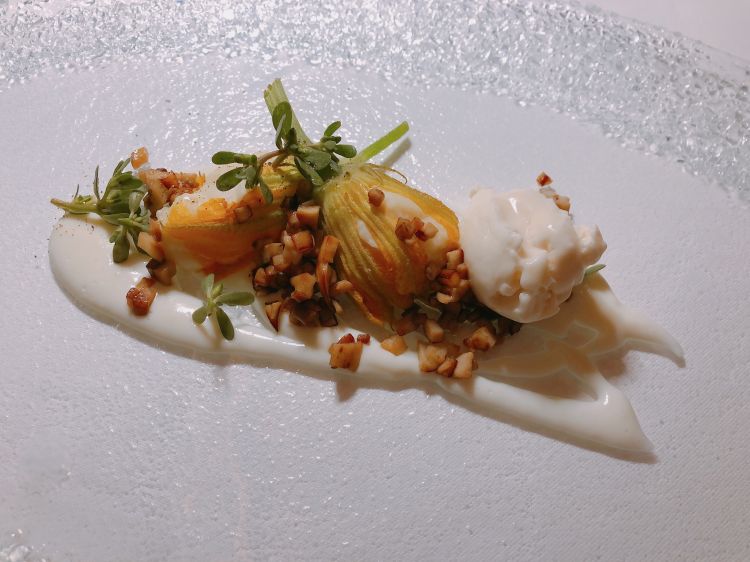 Fiori di zucca ripieni di ricotta, gelato al parmigiano reggiano, porcini trifolati: la delicatezza dei fiori e della ricotta è giustamente “sconvolta” dai porcini e dal gelato al parmigiano (super umami)