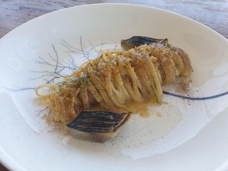 Ma cosa si mangia al Pasigà? Si può scegliere tra due menu degustazione denominati Ritorno alle mie origini, uno di quattro portate e uno di sette. Buonissima la Seppia, gambero gobbetto e pompia, sorprendenti i Fagottini di asparagi zuppetta di cozze e uva gelata. Il fungo cardoncello, chiamato in sardo cordolino ‘e pezza, ha consistenza simile alla carne, viene cotto nel brodo di fieno e poi insaporito con l’olio di lentisco. Una sorpresa è la Mela caramellata liquirizia e polvere di porcini. Nel menu à la carte si può scegliere tra piatti di carne e di pesce, agnello nostrano o quaglia oppure muggine o triglia di scoglio. Non mancano i ravioli, la fregula e le seadas sempre in versione Pasigà.