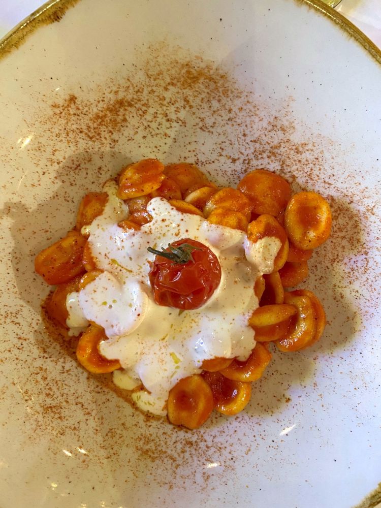 La tradizione si innova, ma senza stravolgersi in Come una lasagna, orecchiette tradizionali fatte a mano, cotte anch’esse nell’acqua di mare, condite con semplice e goloso sugo di pomodoro, crema di burrata affumicata, olio al basilico e polvere di pomodoro rosso. La sensazione in bocca è quella della lasagna della domenica, ma in chiave salentina.