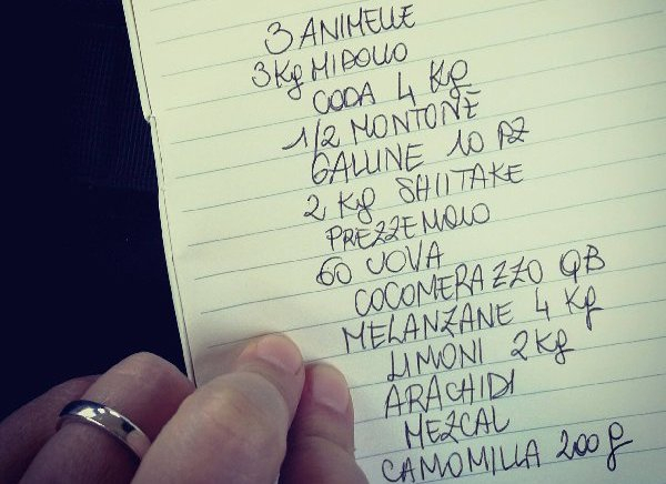 Questi i piatti: Insalata di gallina con brodo ristretto e mezcal; Spalla di montone arrosto, cocomerazzo, cacio e pepe; Crostino di midollo, animella e shitake; Trenette fredde, finanziera di gallina e bonaptit; Tortello di coda, brodo ridotto e camomilla; Polpette di montone in crepinette, crema di melanzane bruciate, limone e arachidi; Tapioca al sangue, mirtilli e sambuco.