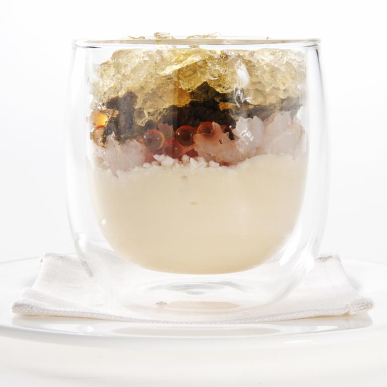 Disporre sulla mousse di cavolfiore il gambero tagliato a fette e battuto, il pompelmo, il taboulet di cavolfiore, il consomme, il biscotto al the verde, poco olio affumicato e infine le foglie di sedano.