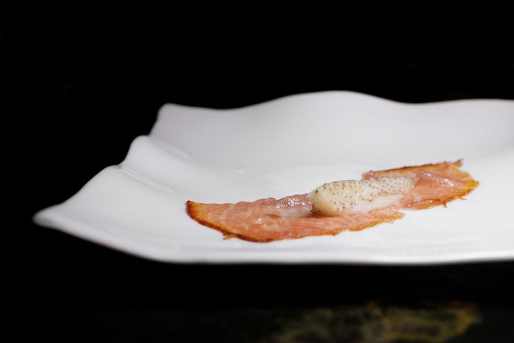 Guanciale di tonno con olio affumicato, caviale di melanzane (il tonno è trattaTo come fosse una guancia di maiale, stagionata in grotta tutto l'inverno). Grande piccola chicca