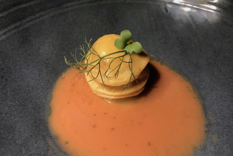 Ravioli ripieni di baccalà e cipolla di Breme, estratto di pomodoro Marinda e burro nocciola