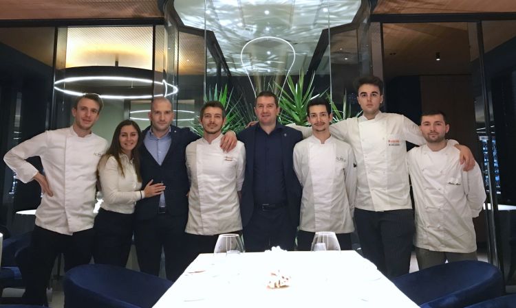 Da sinistra, il sous Roberto Baradel, la chef de rang Greta Milani, il maître Alessandro Farioli, lo chef Alessandro Menoncin, il patron e sommelier Davide Possoni, il sous Marco D' Aleo, i commis Matteo Fumagalli e Pietro Moresco