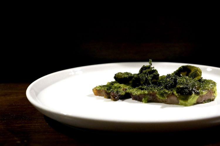 Piccolo capolavoro: Lingua di vitello, salsa verde alle alghe (lattuga di mare, aonori, wakame reidratata nell'aceto maison). Semplice, squisito. La lingua viene bollita in modo classico, poi una finale arrostitura in padella di ferro, senza grassi