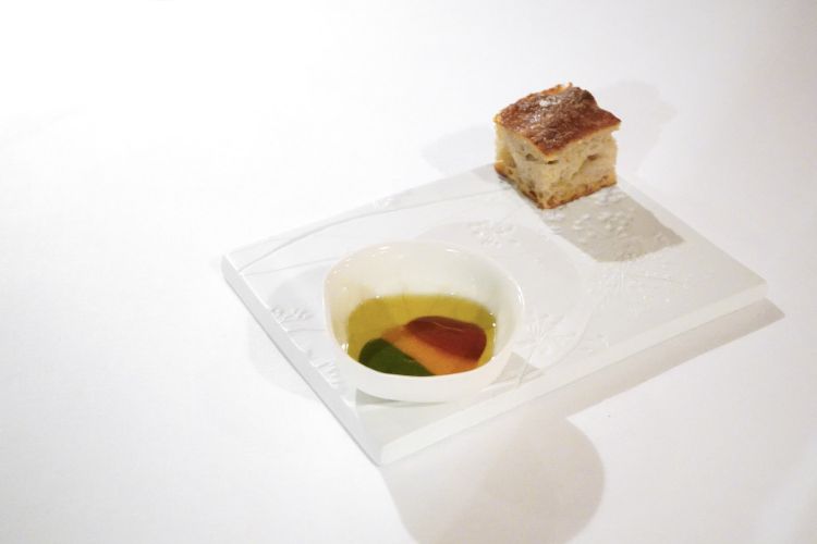 Arriva il servizio del pane che accompagna la carne. Viene proposto un pane speziato sul quale spalmare questa creme brûlé salata al midollo di manzo