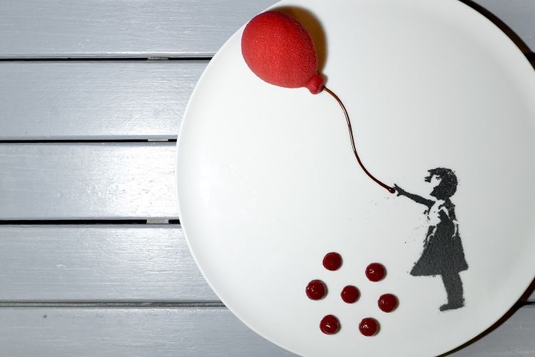 Omaggi a Bansky: pallonccino di mousse allo champagne, inserto alla fragola, cioccolato allo yuzu, polvere di cacao e carbone vegetale, coulis di lamponi