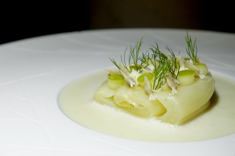 Finocchio cotto in acqua di lupini, tartare di scampi, lupini, sfere di mela verde, merluzzo mantecato, beurre blanc