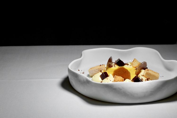 Pappa al pomodoro con terra di olive Taggiasche e caviale di basilico