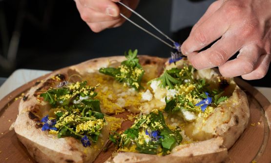 Fior di Cotto (fiordilatte, prosciutto cotto, fiori di zucca, burrata e polvere di olive), nonchè la speciale