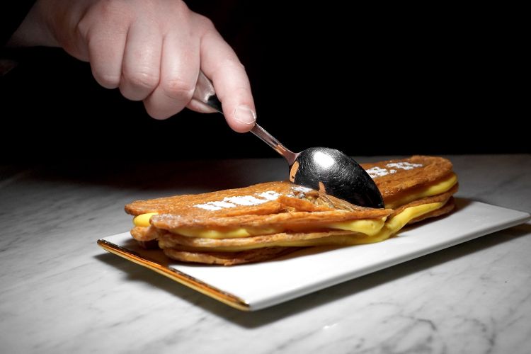 Millefoglie: sfoglia inversa caramellata, crema alla vaniglia, caramello. Bomba