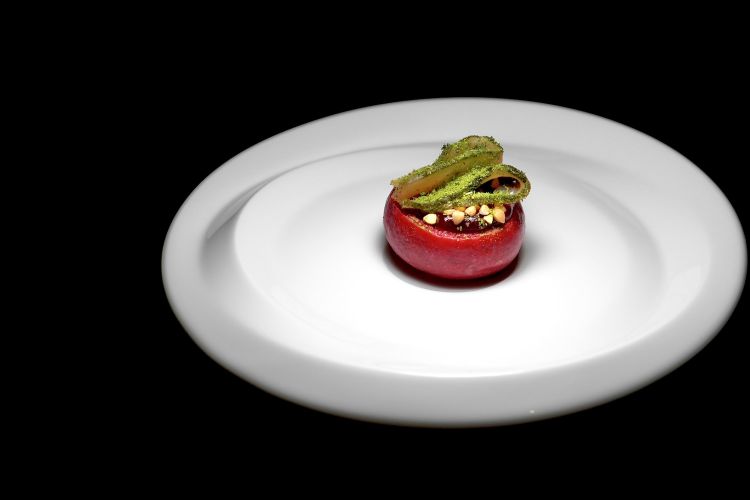 Piccione arrosto profumato alla salvia, jus al mosto d'uva, peperone ripieno (cottura perfetta, c'è la nota di salvia un po' ridondante, peperone eccezionale): nel senso che - vale soprattutto per la triglia - l'assaggio è ottimo ma la materia prima protagonista è così lavorata, l'insieme è così pervaso di salse sontuose, da perdere un poco la propria identità originaria. È una scelta stilistica che richiama un po' una vecchia distinzione culturale, noi italiani (e i giapponesi) più legati alla purezza aromatica del prodotto, i francesi più alla sua manipolazione e trasformazione all'interno di un piatto. Noi preferiremmo che l'equilibrio tra Piemonte e Francia fosse sempre nitido, al