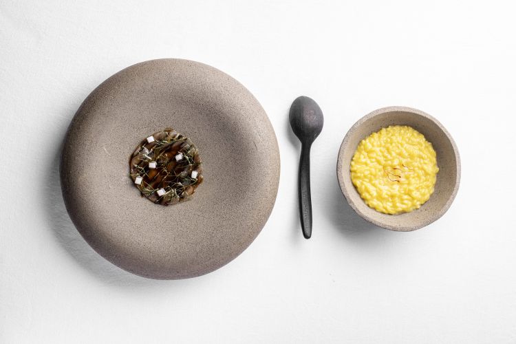 Risone, sgombro, uvetta, zafferano, tra la pasta con le sarde e il riso alla milanese. Il risone viene mantecato con zafferano e burro affumicato allo sgombro, alla base un carpaccio di sgombro affumicato che viene laccato con una riduzione di uvetta, infine midollo di vitello