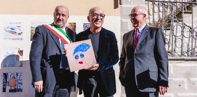Il sindaco di Montalcino Silvio Franceschelli, il registra Ferzan Özpetek e il presidente del Consorzio Fabrizio Bindocci con la nuova piastrella celebrativa