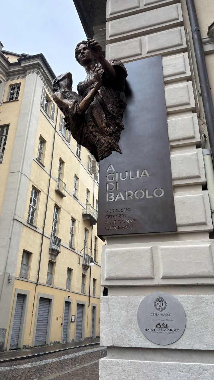 La statua in bronzo, inaugurata a Palazzo Barolo nel cuore della città sabauda, è stata ideata e realizzata dall’artista Gabriele Garbolino Rù, con la curatela di Enrico Zanellati per l’Opera Barolo. L’opera raffigura la Marchesa Giulia accanto a una donna carcerata, colta nel gesto silenzioso della cura. È collocata sulla facciata della storica residenza, all’angolo tra via Corte d’Appello e via delle Orfane, e si inserisce con naturalezza nel tessuto urbano carico di storia. Il monumento, del peso di circa 170 chili e con uno sviluppo complessivo di quasi quattro metri quadrati, trova dimora nel seicentesco Palazzo Barolo, simbolo di una Torino nobile e solidale. L’autore, docente dell’Accademia Albertina di Belle Arti di Torino, si è ispirato ai ritratti conservati nel palazzo e al volume Memorie sui carceri, scritto dalla stessa Marchesa, testimonianza del suo ruolo fondamentale nel supporto alle detenute.