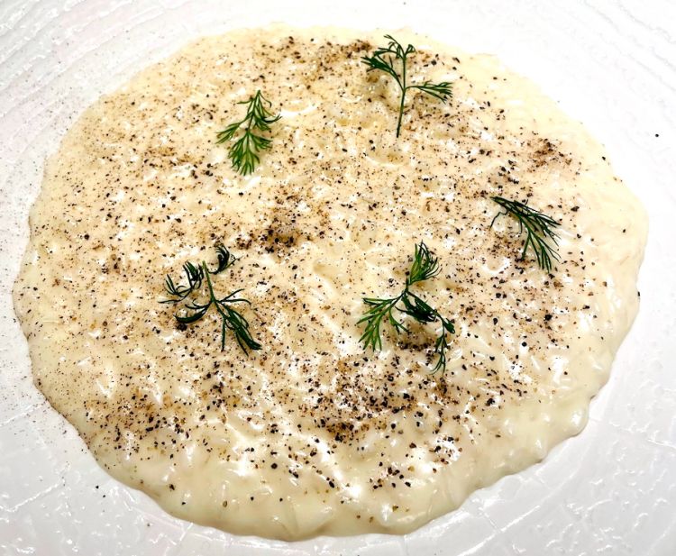 Semplice nel segno di una gradevole Insalata di puntarelle, pecorino e acciughe del Cantabrico; quindi un Risotto cacio e pepe, sapido ma non aggressivo grazie all’eleganza del pecorino romano dop del caseificio