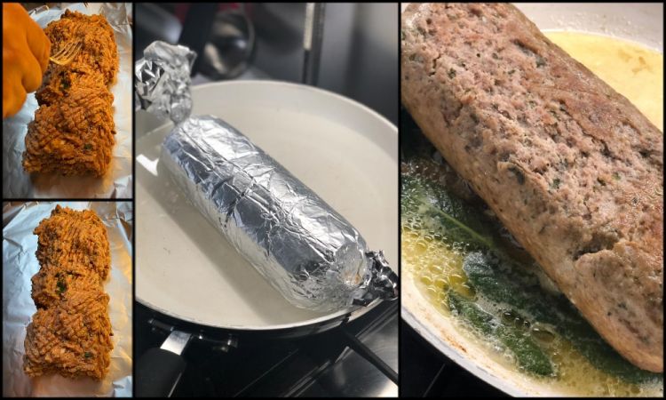 Unire tutti gli ingredienti, mescolando con cura fino a ottenere un composto omogeneo. Stendere il composto su un ampio foglio di carta stagnola, dandogli la forma con la forchetta. Arrotolare la carta stagnola formando un cilindro e chiudendo alle due estremita. Posizionare il polpettone avvolto nella stagnola in un'ampia padella con due dita d'acqua all'interno, portare a leggera ebollizione l'acqua e cuocere per un'ora, girando il polpettone e prestando attenzione a che non resti senza acqua. Poi estrarlo dalla stagnola e rosolarlo in burro e salvia, fino a ottenere una bella doratura.