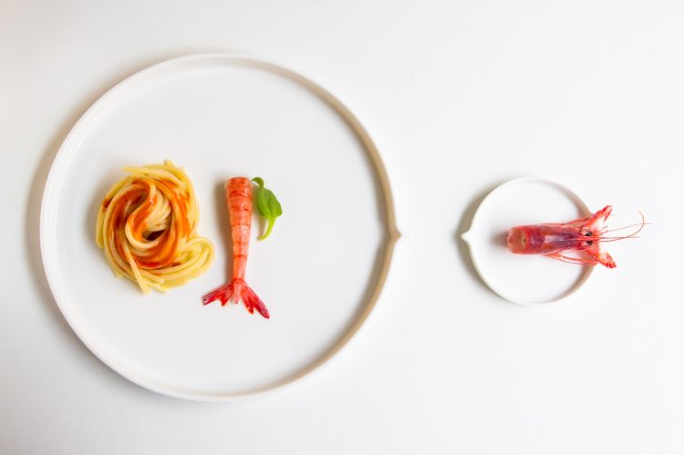 È un'idea nata dalla mia passione per la pasta e per i sapori intensi. Ho cercato di unire la grande espressione gustativa dei gamberi all'intensità della n'duja fondendoli insieme e ricavandone una n'duja di gamberi liquida. Abbinamento al limone di Sorrento con un'infusione nella quale cucio la pasta.