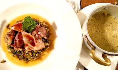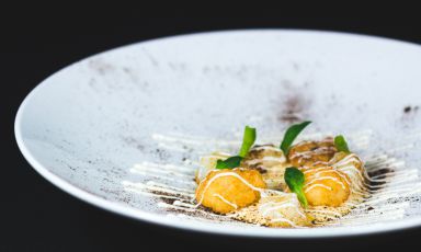 Questo è un piatto del menu primavera dello chef, piena espressione del profondo del mare, di quelle parti più cupe dei fondali marini, che si trasformano poi nella freschezza delle primizie di piselli e il suo estratto (tutte componenti di questa creazione culinaria). Piatto del 2021 perchè è un buon augurio di ripresa per tutti.