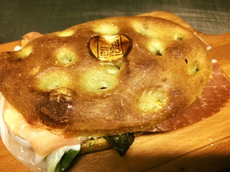 Fokaccia al grano arso con crema di olive taggiasche, salame spagnolo e composta di fichi o ancora la