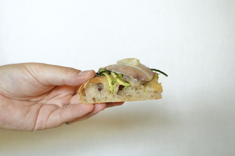 Burro, alici e... (alici cotte nel burro salato, limone fermentato e zucchine grigliate, impasto semintegrale) come "aperitivo". Padoan: «Ho inserito delle proposte con agrumi fermentati come filo conduttore: mi piace perché danno bell'equilibrio e sapidità, poi la citricità ci sta molto bene finché fa caldo»