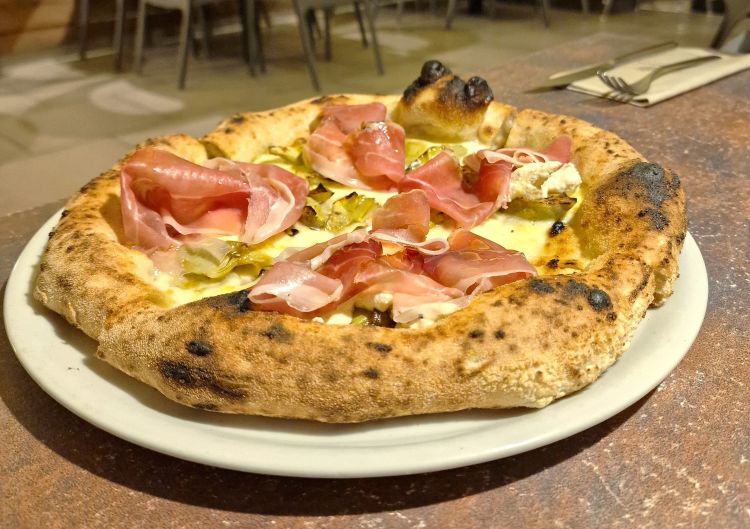 Petra Molino Quaglia 3 HP e Petra 0102 Hp parzialmente da grano germogliato, biga, temperatura controllata, 70% di umidità e 30 ore totali tra maturazione e lievitazione». Il risultato al palato è una pizza di forte identità, unica, contemporanea, fuori dagli schemi classici: acidità e fragranza, bordo di delicata croccantezza, interno masticabile di eccellente consistenza e di grande piacere. L'assaggio evidenzia una cultura tecnica importante nell’impasto e un’attenta ricerca per la materia prima utilizzata per i topping: ingredienti locali, stagionali e freschi, con una particolare attenzione alle piccole produzioni artigianali e ai presidi Slow Food.