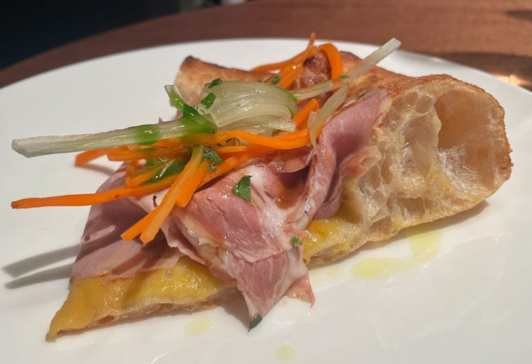 Mast' Mario in oriente, con crema di patate affumicate, fiordilatte, pancia di maiale marinata in salsa di soia, cipolla rossa di Tropea fermentata, prezzemolo. In questo caso la base è invece classicamente cotta al forno, con lo stile napoletano: di grande morbidezza al morso, ha però una sua struttura che sorregge bene il condimento così ricco. Il cornicione, in tutti i nostri assaggi, è risultato ben lievitato, ma senza esagerazioni canottesche andate di moda ultimamente.