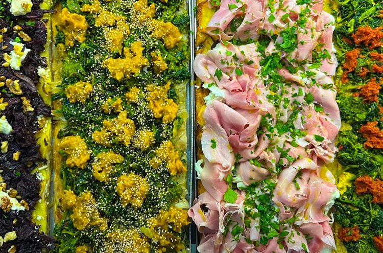 La grande protagonista è e rimane la pizza in teglia, con le sue caratteristiche che la rendono riconoscibilissima: il colore dorato brunito, la croccantezza che si percepisce già alla vista, l’alveolatura ampia e poi un morso sonoro e soffice allo stesso tempo. E i sapori? Ci sono tutte dalle ricette iconiche capisaldi al banco alle ultime novità. In questa serata amarcord non è mancata, infatti, la