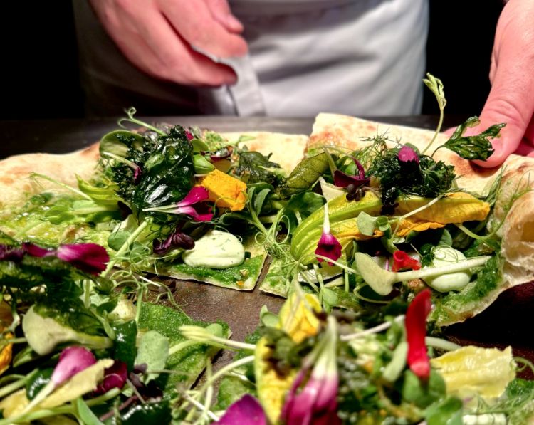 Davide in chiave personale. Una vera sinfonia vegetale che gioca su consistenze e freschezze: crema di bietole, spuma di ricotta e basilico, insalata di puntarelle, germogli di ravanello, borragine, coriandolo, pisello, basilico rosso, aglio, bietola rossa, lupino e acetosella, lattughino romano, gelé di lattuga, fiori di zucca, aneto, basilico cristallizzato, foglie di sedano cristallizzate, fiori di zucchine, polvere di timo e fiori eduli misti. Un lavoro di equilibrio che rimanda all'alta cucina e dimostra come la pizza possa farsi piatto complesso senza perdere identità.