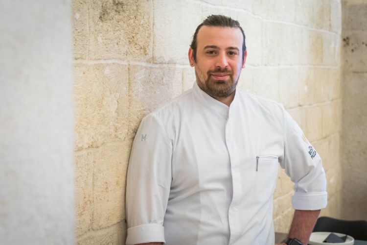 Polpo a colori: una base cotta su pietre di fiume, con polpo a bassa temperatura ripassato in forno a legna, spuma di mozzarella, ricotta e pecorino, salsa di pomodoro San Marzano, crema di porri confit, salsa di datteri gialli, salsa di sedano e olive nere disidratate. Un piatto che racconta bene la sua filosofia: tecnica, visione e capacità di sorprendere senza dimenticare il legame con la materia.