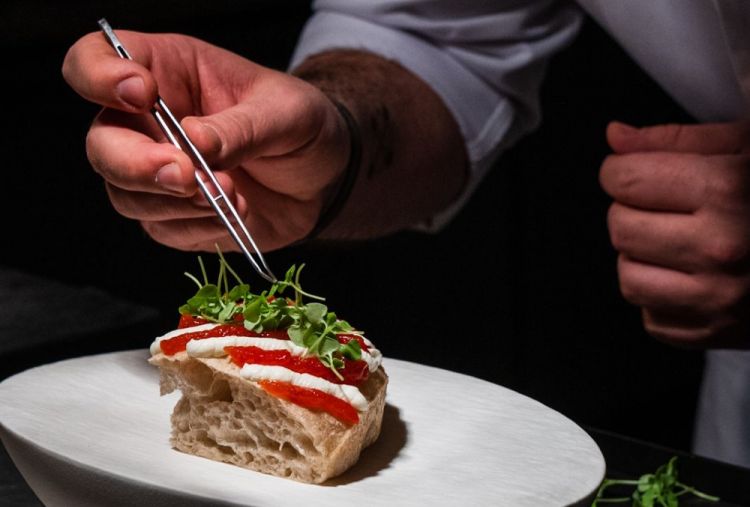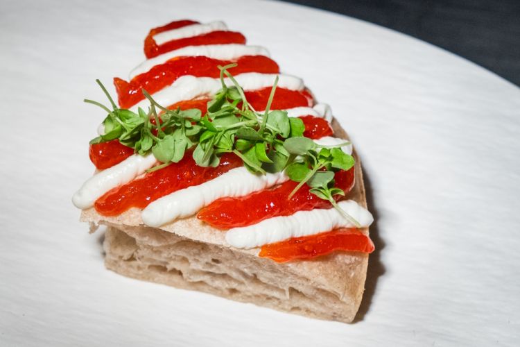 Margherita dolce. Qui la pizza viene cotta a vapore e poi ripassata in forno statico per ottenere un contrasto di morbidezza interna e croccantezza esterna. In superficie, marmellata di pomodoro riccio, spuma di ricotta dolce, germogli di basilico e olio monocultivar Coratina. Un dessert che chiude il cerchio, evocando la pizza più iconica e trasformandola in un finale inaspettato.