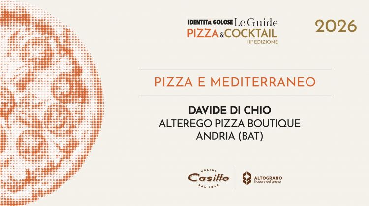 Motivazione. “Pizza e Mediterraneo” premia chef pizzaioli che sappiano proporre assaggi non solo di eccezionale qualità, sia nell’impasto che nel topping, ma grazie al cui lavoro la pizza sa assumere modalità espressive che la rendono protagonista dell’arte del buon vivere mediterraneo. Come accade ad Andria, grazie alla creatività di Davide Di Chio al suo Alterego Pizza Boutique.