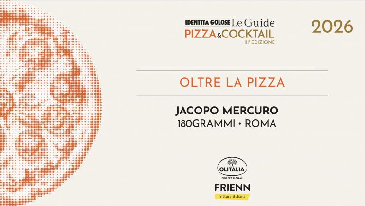 Motivazione. Cosa si mangia in pizzeria? La pizza, ovviamente. Ma ci sono locali che sanno integrare la protagonista principale, eccellente di suo, con sfizi che la precedono d’incredibile qualità, a loro volta memorabili. Insomma: sanno andare oltre la pizza. Ciambella alla cacciatora, Osaka waffle, Supplì al telefono, Croquetas e Sanpietrini: Jacopo Mercuro non ci fa mancare nulla, al suo 180 grammi.