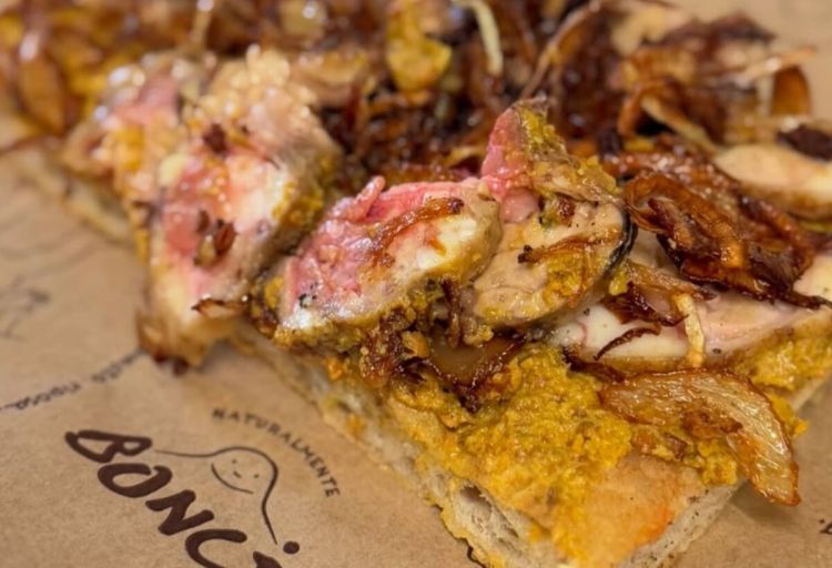 Bonci le nobilitata sulla pizza, offrendo una consistenza burrosa e un sapore delicato ma persistente. Poi troviamo un hummus di lenticchie di Rascino, che portano terrose e minerali. Infine, una cipolla fritta al miele: elemento che fornisce dolcezza e croccantezza.