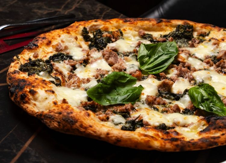 Salsiccia e friarielli. La pizza è presentata nel formato classico a ruota di carro, sottile ed estesa oltre il bordo del piatto, simbolo della generosità partenopea antica. Il topping è un classico intramontabile nobilitato dalla selezione delle materie prime. I friarielli sono preparati secondo la ricetta napoletana, abbinati alla salsiccia di suino umbro, scelta per la sua particolare grana e speziatura. A legare il tutto, la filante provola affumicata e una spolverata finale di Pecorino Bagnolese, un formaggio ovino locale che conferisce una piccantezza sapida e persistente.