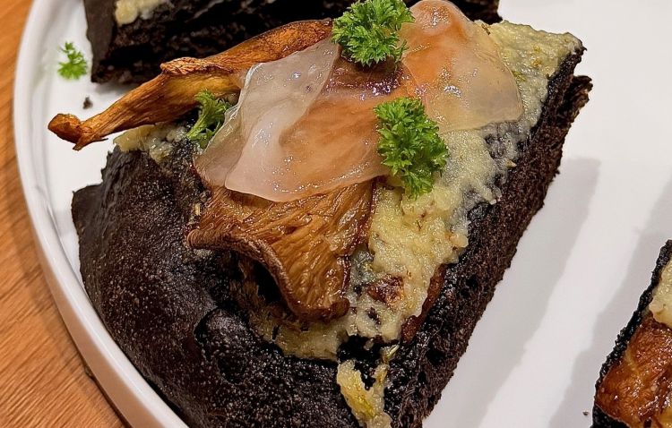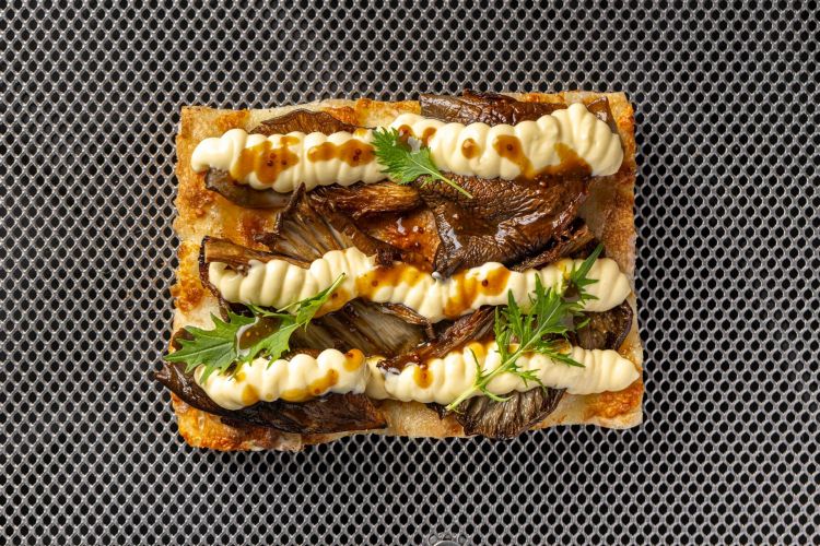 Funghi e crema pasticcera salata. La base di questa pizza scardina le aspettative, con una crema pasticcera salata al provolone affumicato. Su questo letto vengono adagiati funghi pleurotus ripassati classicamente (aglio, olio, prezzemolo) e una demi-glace con senape in grani, che aggiunge profondità e piccantezza. Nota di merito: