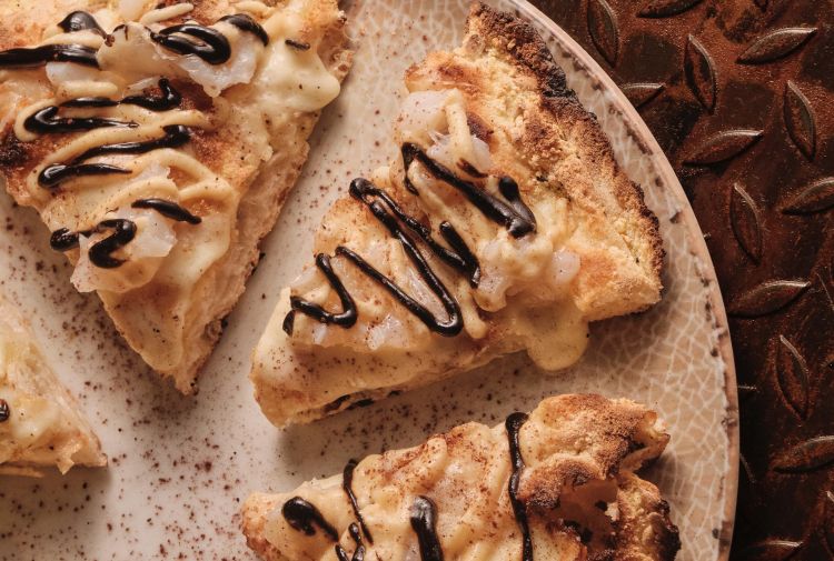 Pizza ai Formaggi 2.0, una creazione che supera la classica quattro formaggi lavorando sulle texture e sulle intensità lattiche. La base è un mpasto ad alta idratazione, alveolato e friabile. Su cui troviamo una sinfonia di eccellenze casearie che include Gorgonzola in due consistenze, per giocare tra cremosità e piccantezza, crema di Caprino per una nota acidula fresca, Raschera (omaggio al territorio piemontese) e Grana Padano per la spinta sapida finale.