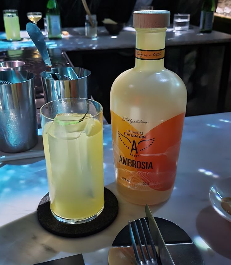 Altro gin altro regalo. Questa volta è Impavid Luxury Gin, omaggio al rinascimento italiano attraverso la scelta di bottiglie iconiche come quella dedicata a Michelangelo. Protagonista insieme al marsala e a un’acqua di pomodoro nel cocktail abbinato a un piatto a base di seppia, topinambur e liquirizia che ha retto bene l’acidità e l’impronta decisa del drink.