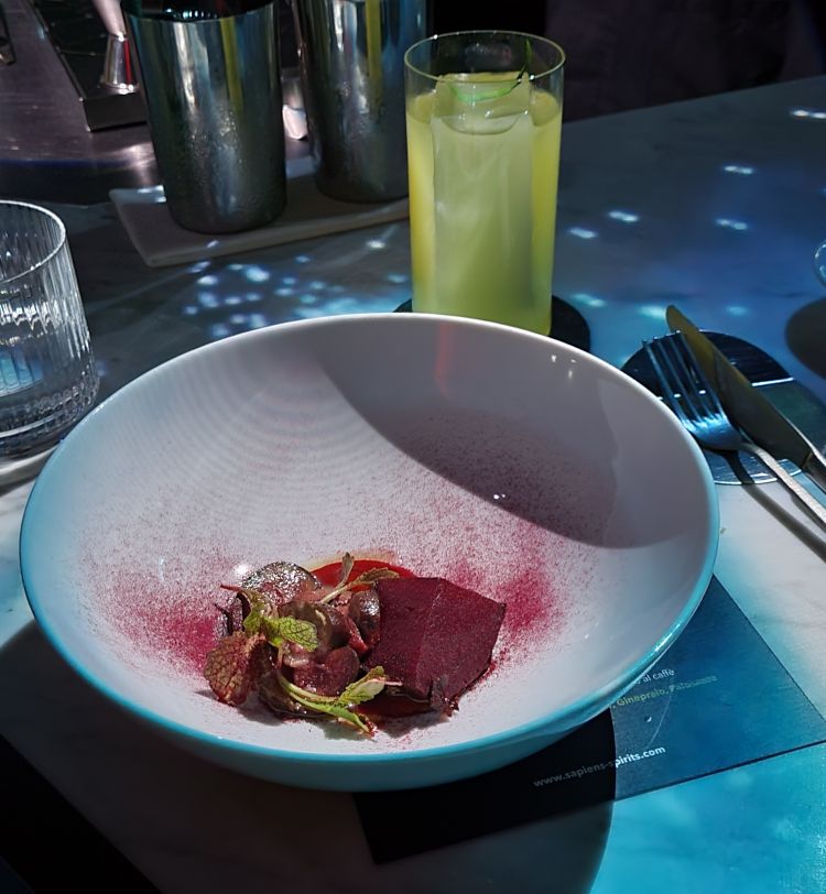 Gustosa e sfiziosa la Barbabietola in scapece con rognone con fondo di peperoni a cui Francesco, il barman di Carico dedicato alla serata, ha abbinato un drink a base di gin Ambrosia, brand attento alla sostenibilità che utilizza bottiglie in vetro riciclato, con succo d’arancia chiarificato e mezcal e olio di sesamo tostato.