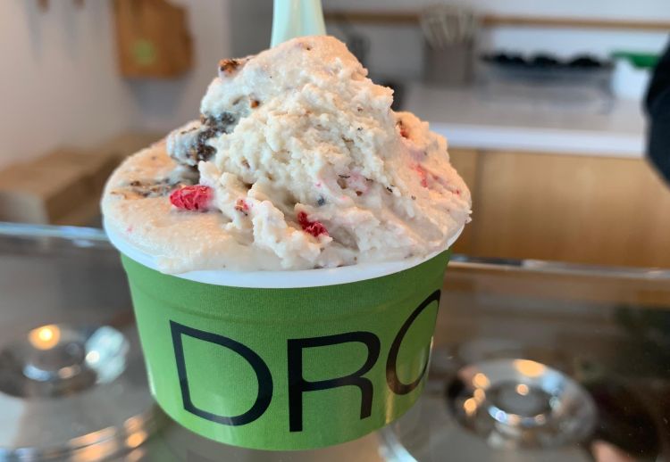 Drop Gelato, a Brescia, in Lombardia. Un gusto intenso che racconta i profumi del bosco. Creato con un’infusione di aghi di pino, corteccia di quercia e gemme di pino nel latte e nella panna. Con un’aggiunta poi di crumble di grano saraceno, funghi porcini e nocciole. Il gelato, aromatico e intenso è finito con dei lamponi che regalano freschezza e una nota acida.