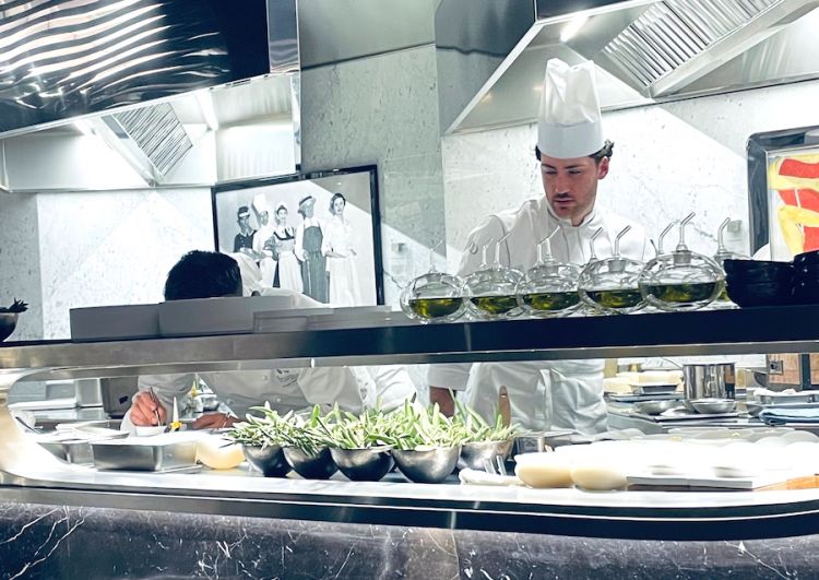 E ora accomodiamoci a uno dei tavoli davanti al lungo bancone di una cucina a vista guidata da Iacopo Iualè, 34 anni, toscano di Cecina, cresciuto all’Alma a Colorno (Parma), quindi in scia al maestro transalpino prima al Louis XV a Monaco, poi a Le Meurice a Parigi. A Roma è arrivato a