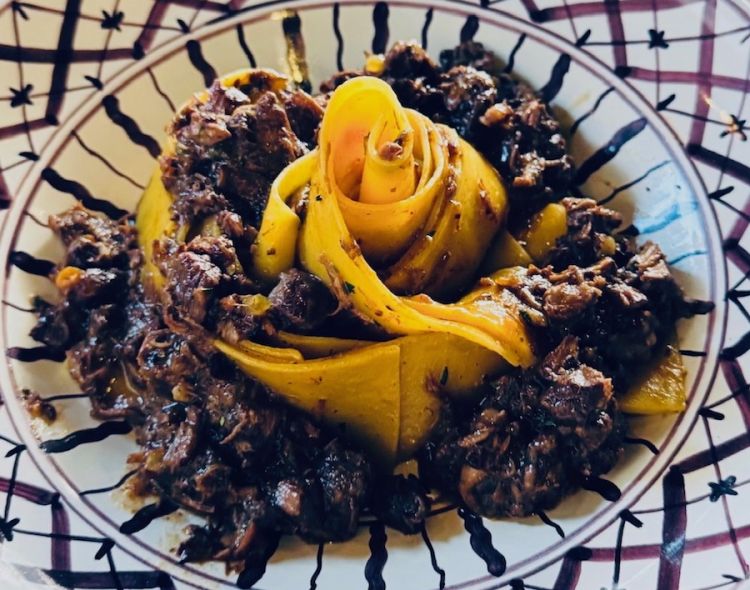 Due pure i primi a iniziare dal Picio, crema d'aglione, cacciucco, tamarindo. I pici traggono ispirazione dalla tradizione locale e vengono tirati a mano con l'aggiunta di polvere d'alghe marine. Poi mantecati in una salsa di pesci di scoglio e finiti con una salsa di triglia al Brunello e tamarindo che gli conferisce una spiccata acidità. L'aglione, prodotto tipico della Valdichiana, viene aggiunto al tavolo sotto forma di leggera spuma. Al lato la rappresentazione di tutti i pesci di scoglio presenti nelle salse. Poi Gnocchi Monnalisa, noci, levistico, Funghi di bosco. Gli gnocchi