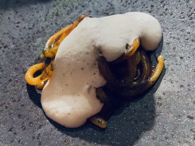 clementine e zucca, delle foglie di minestra nera coltivata nell'orto, e finita con una salsa ricavata dalla sua testa. Al lato un mandarino bruciato farcito con una spuma di corallo e falde di Hokkaido. Quindi la Bieta dell'orto, arancia sanguinella, jus di coste. Alla base un kimchi di bieta e arancia candita, sul quale viene messa una spuma sempre di biete, foglie di bieta brasata e le sue coste cotte in bianco. Il tutto terminato con una salsa di coste stile jus di carne. Al lato un barbajuan farcito di bieta e arancia.