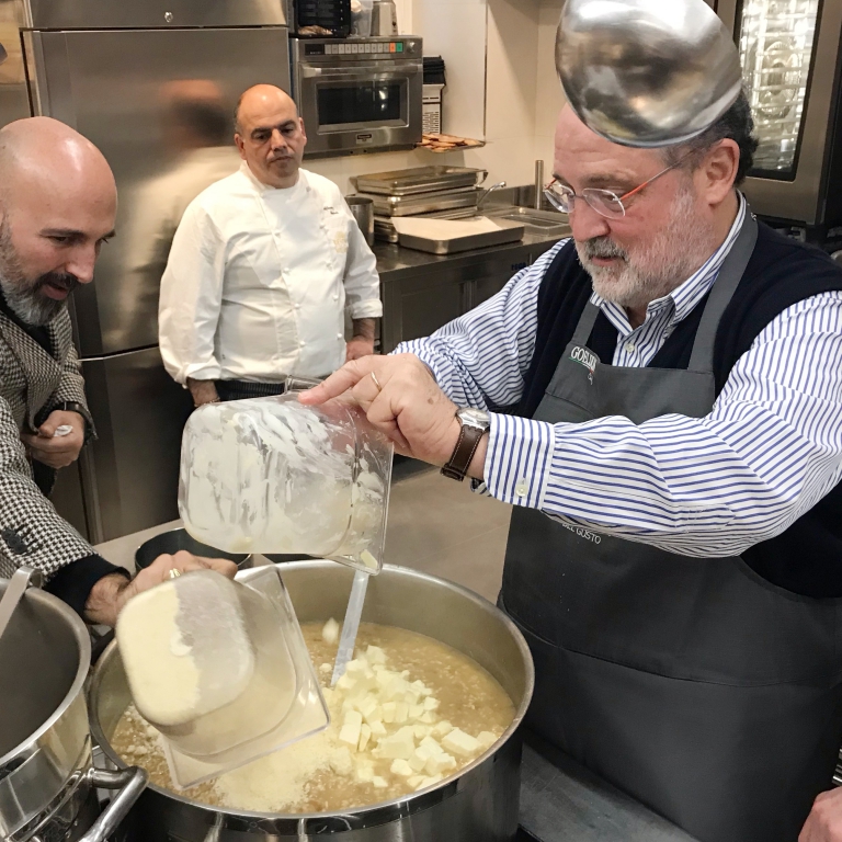 Paolo Marchi, alle prese con una pentola enorme piena di svariati kg di Carnaroli, un’altra colma di ottimo brodo e, a fine cottura, una generosa dose di Grana Padano e di burro per la mantecatura. Poi tutti al pass, a riempire le fondine: il risotto è servito, tra gli applausi di tutti. E ora la ricetta la conoscete anche voi, sia nella sua versione più semplice, che in quella più elaborata, da professionisti.