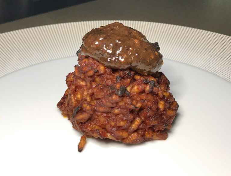 Riso riscaldato al concentrato di pomodoro, prugna, vermouth
