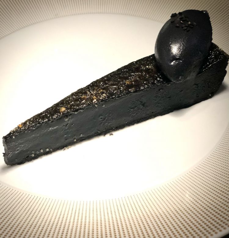 Questa volta non siamo nel Pavese, ma in quella zona di conforto e di piacevole assestamento delle papille gustative: destinazione dolcezza con una classica lemon tart, in versione total black, e nero è anche il sorbetto al limone e rosmarino che, insieme, richiamano le note balsamiche del Buttafuoco Storico in abbinamento.