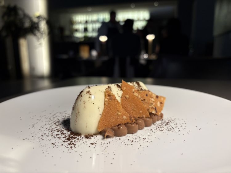 Bavarese al cioccolato, cremoso al caffè e tuile alla nocciola firmata da
