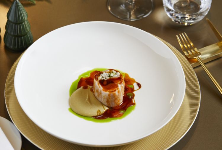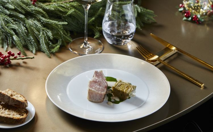 Lombo di coniglio farcito con lardo ed erbe del Mediterraneo, crema di carciofi spina e sugo alla cacciatora. «Il coniglio è una carne molto presente nella tradizione ligure durante le festività», racconta lo chef, fiero delle proprie origini. «Abbiamo deciso di utilizzare solo la parte del lombo e della pancia, farcite con un battuto di erbe e lardo. Lo cuociamo sottovuoto, poi lo scottiamo per ottenere un bel medaglione. Lo abbiniamo ai primi carciofi spina che troviamo in questo periodo, in crema, e a un sugo alla cacciatora preparato con le carcasse e le cosce del coniglio, come vuole la tradizione ligure: con una parte di pomodoro, capperi, pinoli. Sarà il nostro benvenuto di Natale, di Vigilia, come antipasto».