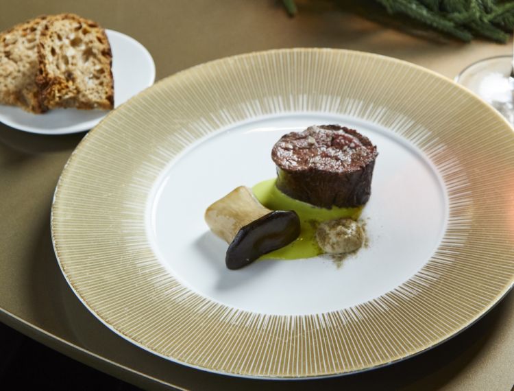 Il secondo è il Filetto di manzo arrosto, zabaione al dragoncello, crema di funghi e cardoncello in olio cottura: «Il filetto di manzo è una di quelle cose che si trovano spesso nei menu delle festività, magari proposto alla Wellington, mentre noi ci siamo concentrati sulla carne. Il filetto viene cotto alla plancia, poi messo a riposare a 54 gradi per farlo rilassare totalmente. Lo abbiniamo a uno zabaione realizzato con un olio infuso al dragoncello. Il cardoncello viene cotto in olio cottura a 90 gradi per circa tre ore, poi lo spadelliamo; con le parti meno nobili e i gambi facciamo la crema di funghi».