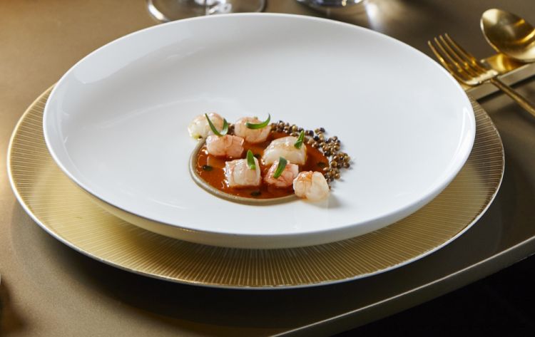 Si parte con il Gambero in crosta di pane, maionese e senape in grani, uno degli amuse-bouche di benvenuto. «Con la parte centrale del pane creiamo una sorta di involucro croccante. All'interno il gambero resta quasi crudo, perché la crosta viene nappata con olio molto caldo: il risultato è molto dorato e croccante fuori, ma all'interno il gambero rimane alla giusta temperatura. L'abbinamento con la maionese classica e la senape in grani, leggermente piccante, lo rende molto sfizioso».